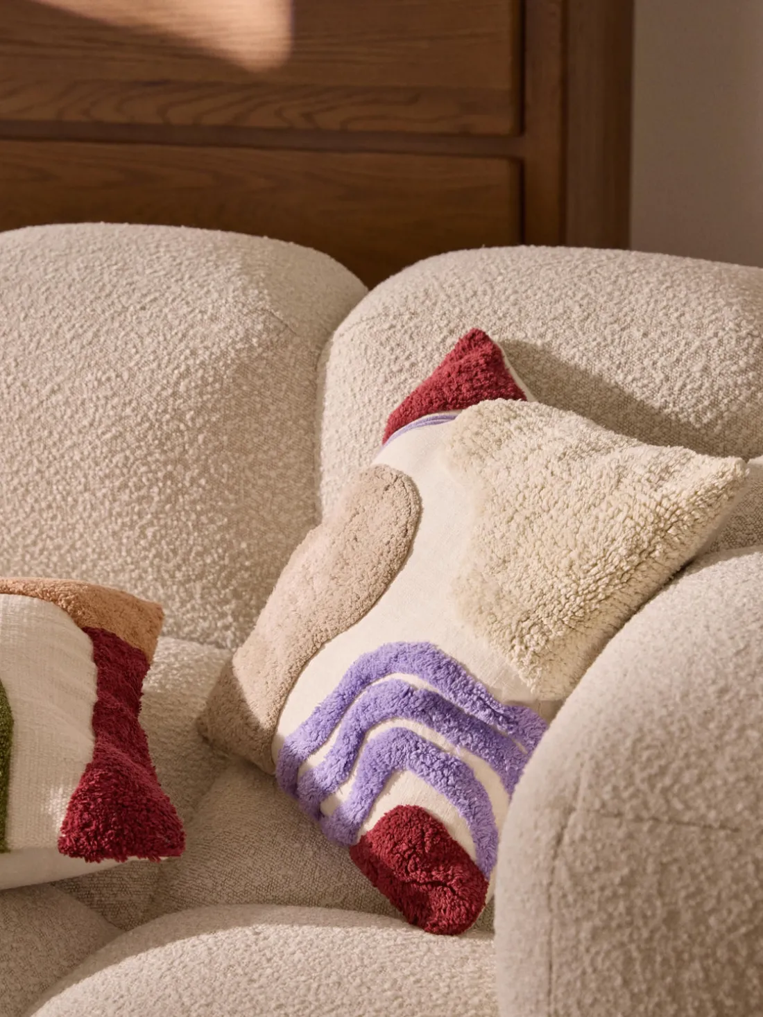 CORALINE impresiona con sus patrones abstractos y ondulados, elaborados artísticamente en la parte delantera con elaborados mechones y bordados de cordón. ¡Una verdadera delicia para los ojos en tu sofá o cama!