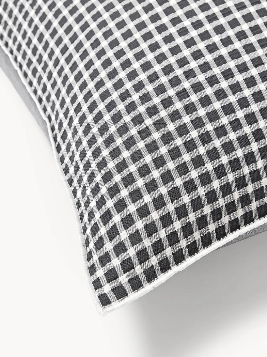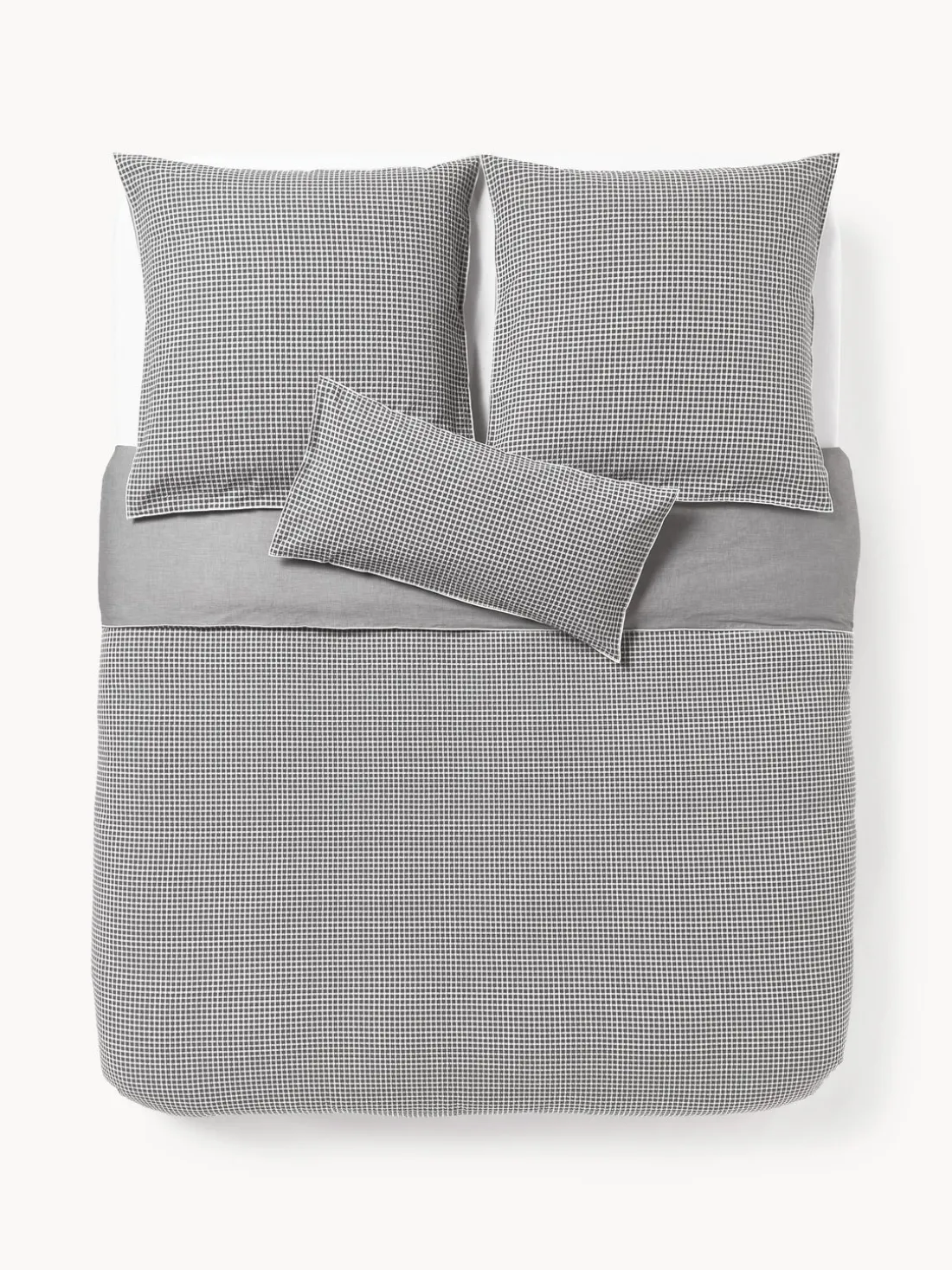 Funda nórdica de sirsaca con parte delantera a cuadros y parte trasera monocromática, tipo de cierre con botones. Hecho en Portugal.