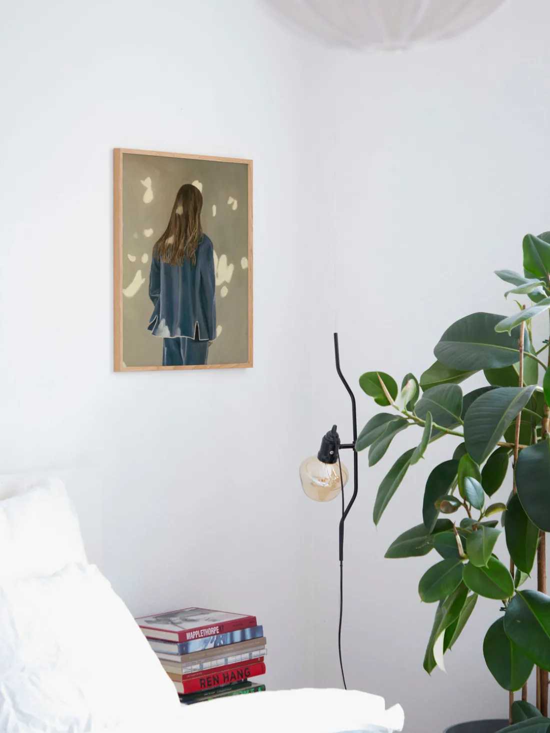 LIGHT AND SHADOW de la artista sueca Jonna Valtner expresa su capacidad para capturar momentos sutiles a través de texturas ricas y colores suaves. Una figura solitaria vestida de azul se encuentra en la escena mientras la luz moteada se derrama sobre ella, añadiendo una dinámica gráfica a la composición.