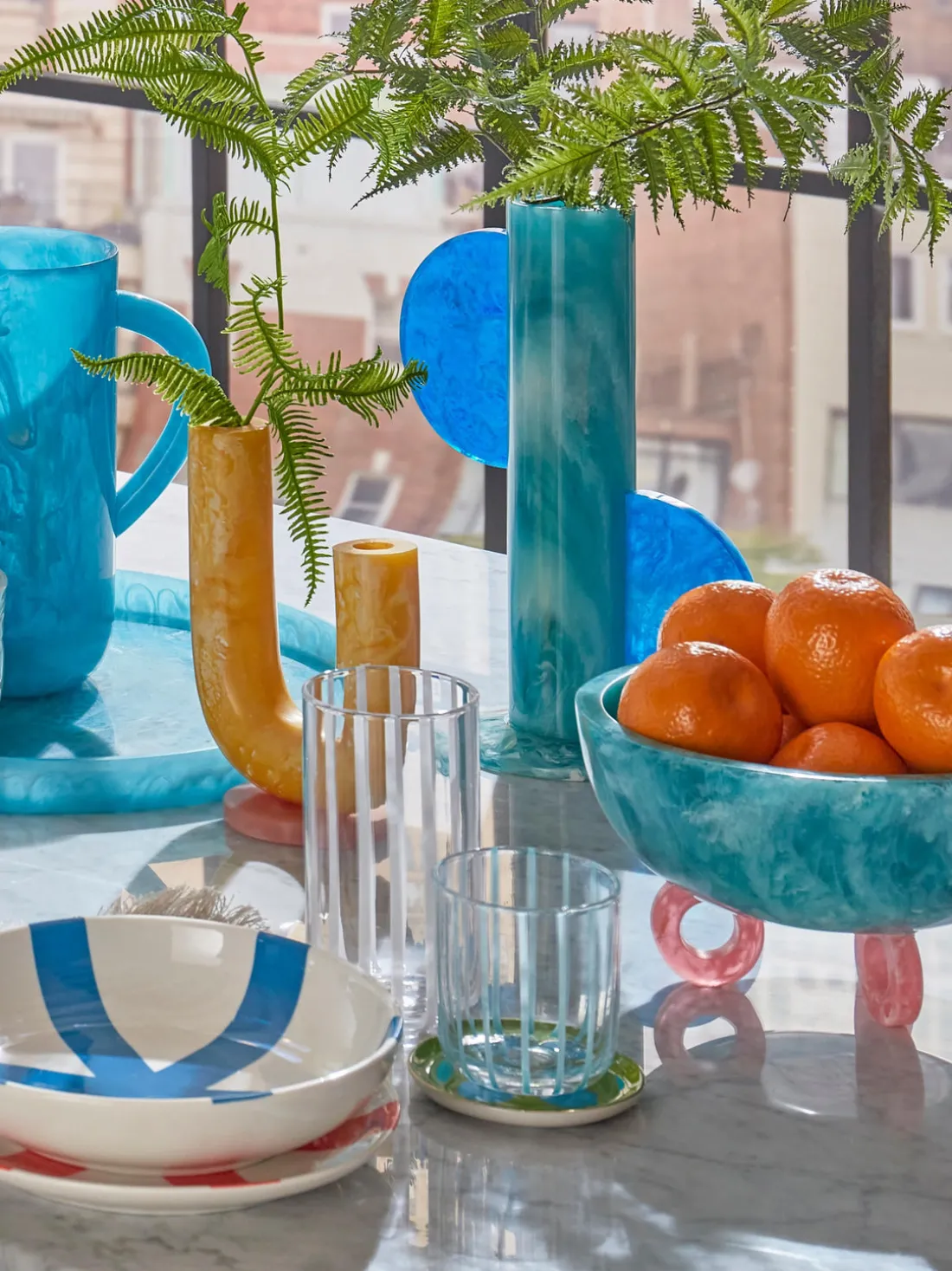 La fascinante colección Mustique combina jugosos colores con atrevidas geometrías. Cada pieza se moldea a mano y se pule a la perfección luminosa para crear un acabado jaspeado único. Con remolinos de colores amapola, Mustique aporta un brillo original a cualquier mueble y crea un momento único en tu hogar.