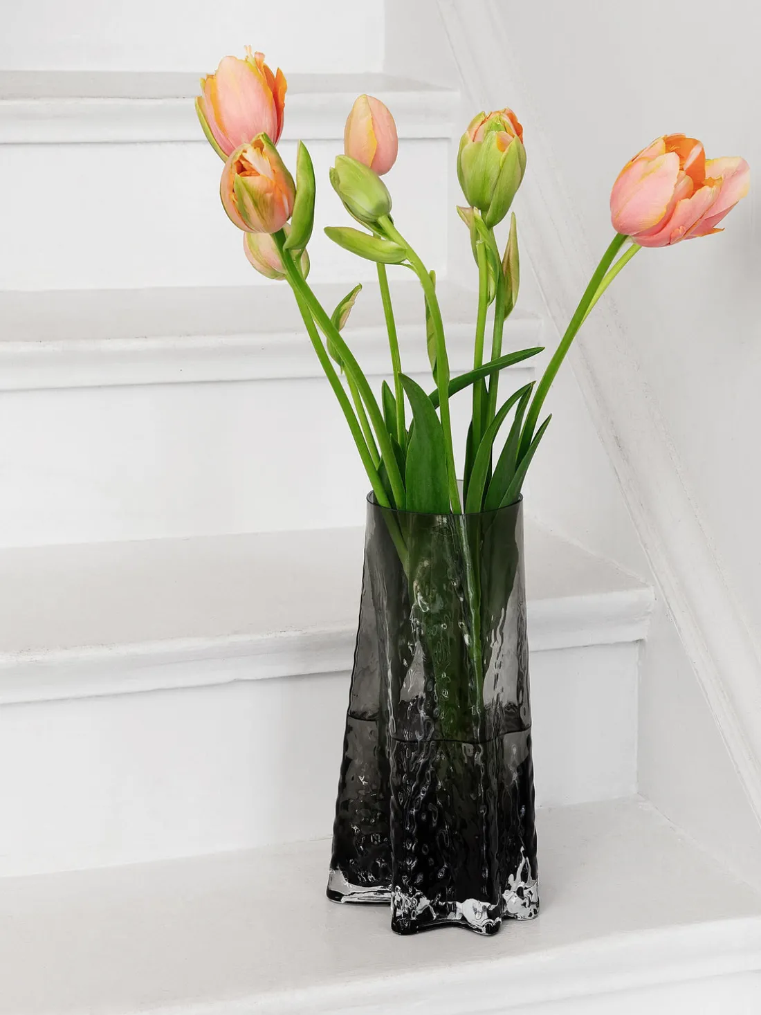 La colección Gry está hecha de vidrio soplado artesanalmente lo que hace que cada pieza sea única. La colección contiene jarrones y portavelas, todos en tres colores diferentes. Con ricos detalles, los jarrones son esculturas elegantes que mejorarán tus ramos de flores, además juegan con la luz del día gracias a su superficie estructurada y de color. El portavelas toma la luz de la llama en su interior y la convierte en un hermoso patrón proyectado sobre la superficie donde está. La inspiración para la forma proviene del tronco de los árboles. Comenzando desde el suelo, puedes ver el comienzo de las raíces antes de volverse más redondas más arriba. Gry, que significa amanecer en danés, tiene diferentes asociaciones de palabras, ya que también es un juego con la palabra gro que significa crecer. – Diseñado por Tim Torp Hansen, Five Seven