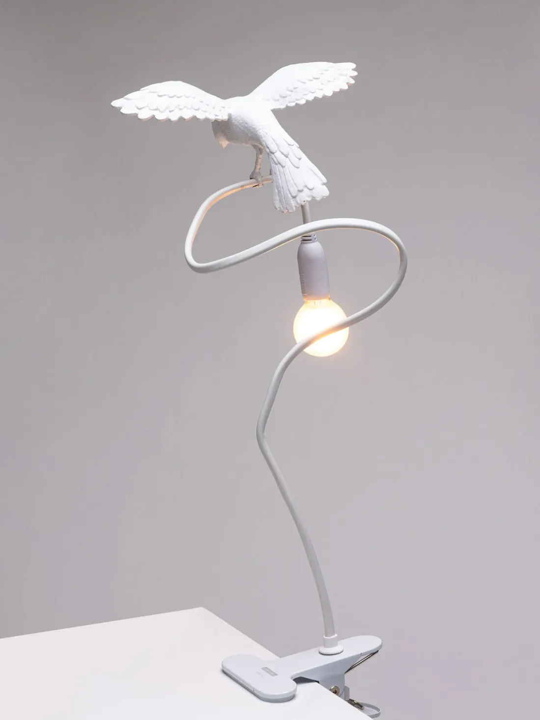 La lámpara Sparrow es un producto de la marca Seletti, conocida por sus inusuales soluciones de diseño de interiores. La lámpara de sobremesa Sparrow está equipada con un clip que se sujeta al escritorio.