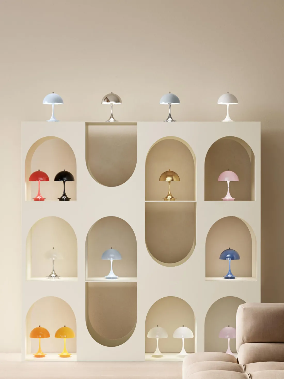 La PANTHELLA fue diseñada en 1971 por Verner Panton en colaboración con Louis Poulsen. Su inusual diseño no sólo refleja el estilo lúdico de Panton, sino que también proporciona una luz única y agradable gracias a sus formas orgánicas. La pantalla semiesférica emite la mayor parte de la luz hacia abajo, donde se refleja en la base en forma de trompeta y baña el entorno con una luz suave y difusa.
