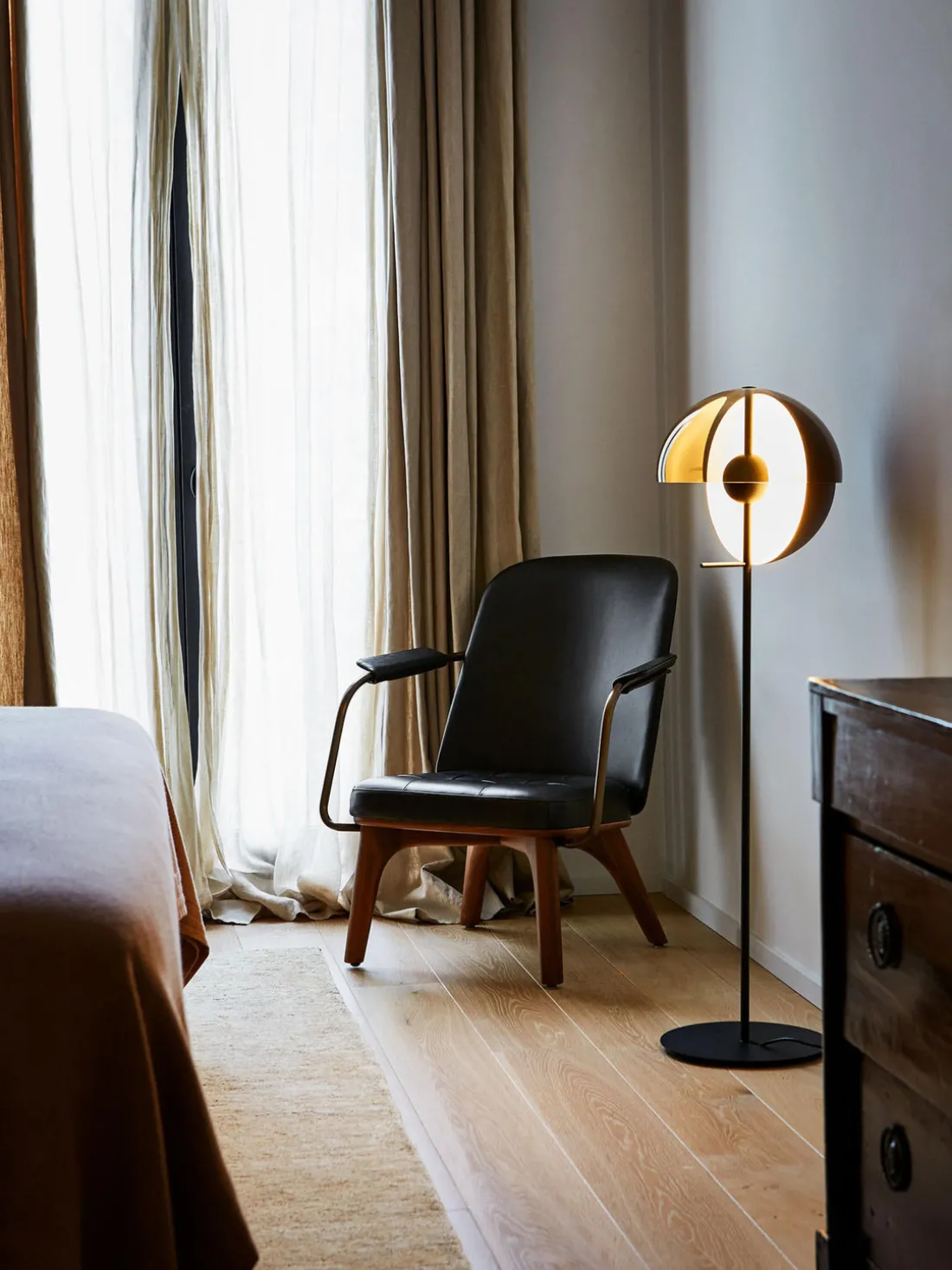 Theia tiene dos caras: para descubrirlas, sólo hay que girar la lámpara sobre su eje central. Puede alinearse hacia ti y utilizarse como lámpara de lectura, o dirigirse hacia un objeto o una pared, creando una luz sutil e indirecta que calienta inmediatamente el ambiente. Como la pantalla metálica de Theia es completamente opaca, esta rotación transforma completamente la percepción de la pieza.