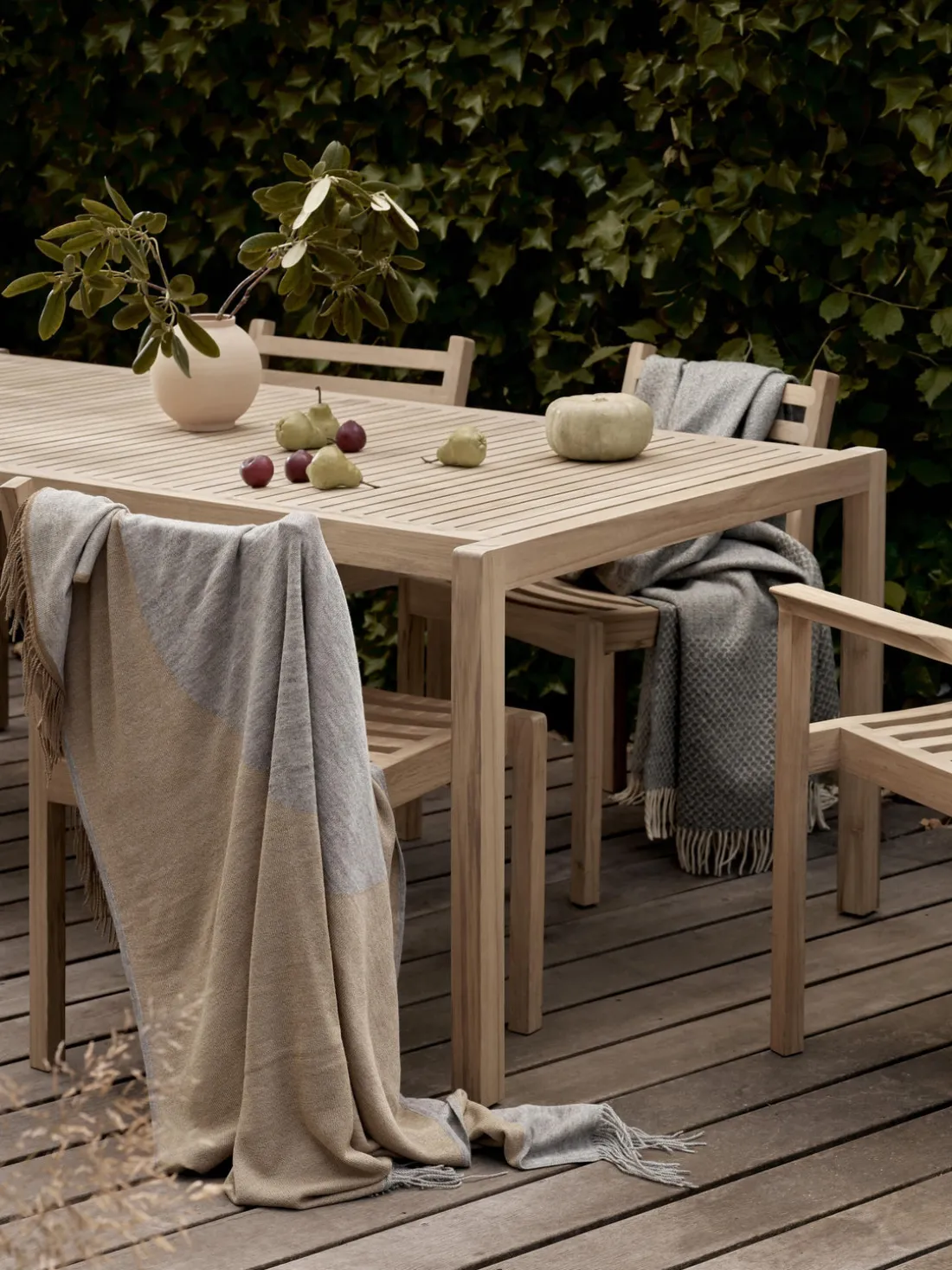 Para conservar la madera maciza durante mucho tiempo, conviene volver a barnizarla una o dos veces al año con un aceite convencional para muebles de exteriores.