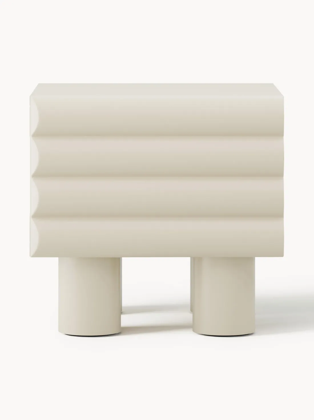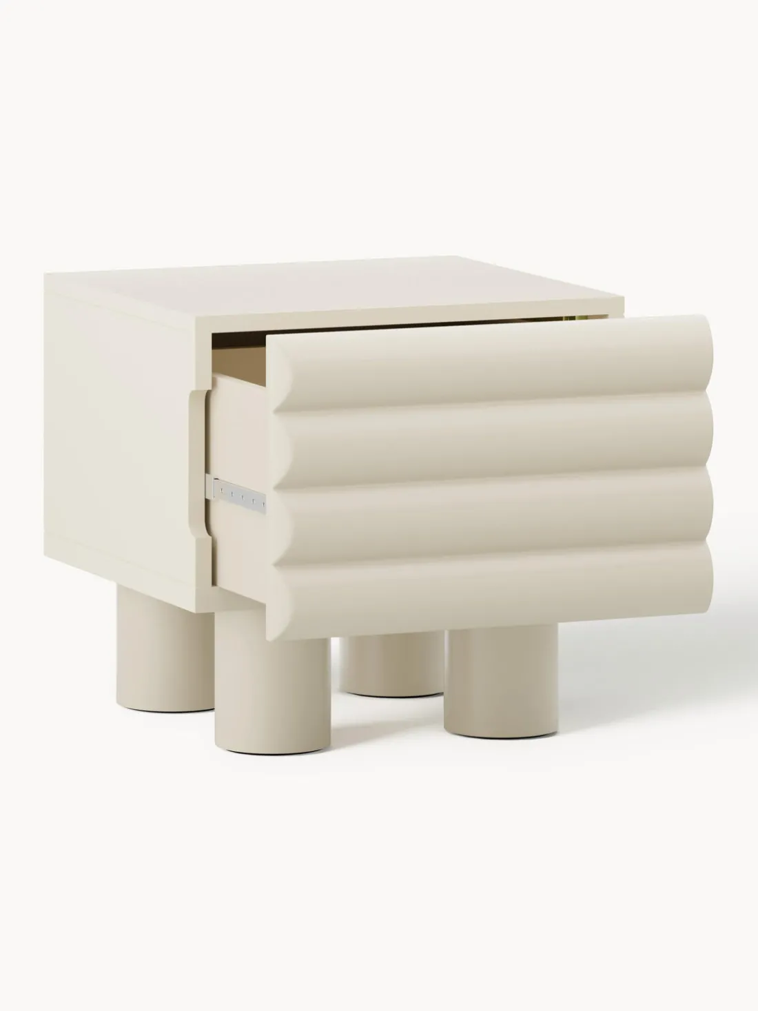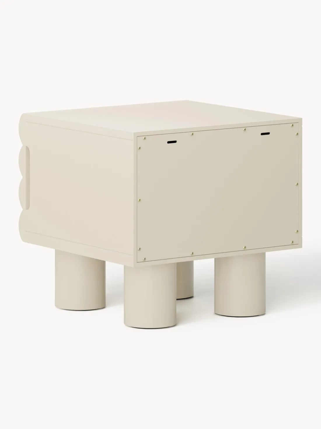 Con unas dimensiones compactas pero prácticas, Fana ofrece almacenamiento eficiente sin ocupar demasiado espacio. Las patas de madera de álamo elevan la estructura, facilitando la limpieza y añadiendo un toque de ligereza visual. El espacioso cajón interior proporciona suficiente espacio para guardar pertenencias esenciales, soportando hasta 20 kg.