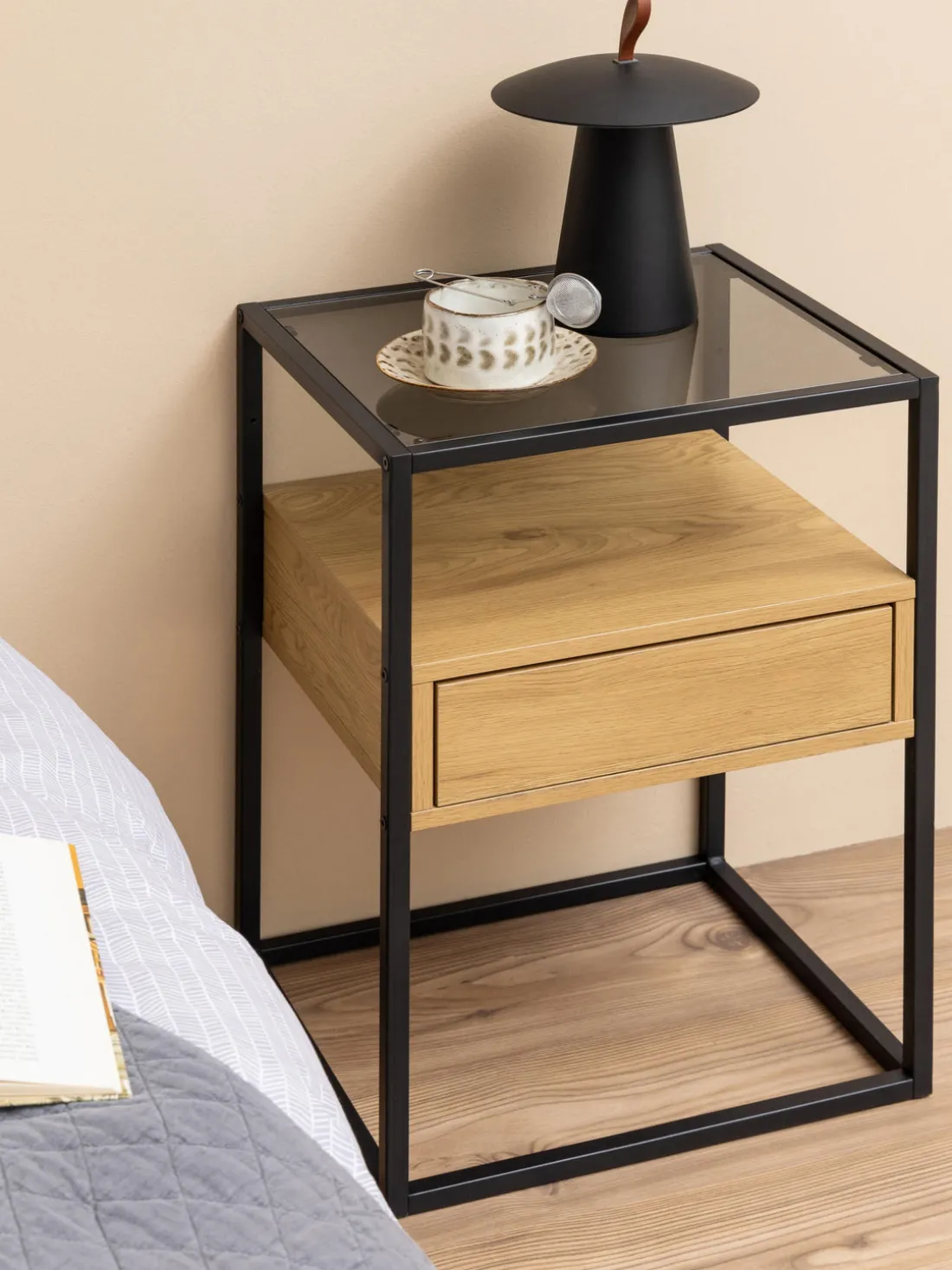 Esta mesita de noche tiene un cajón.