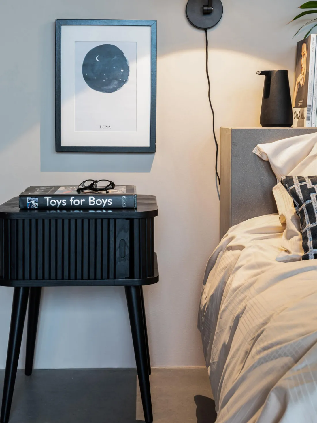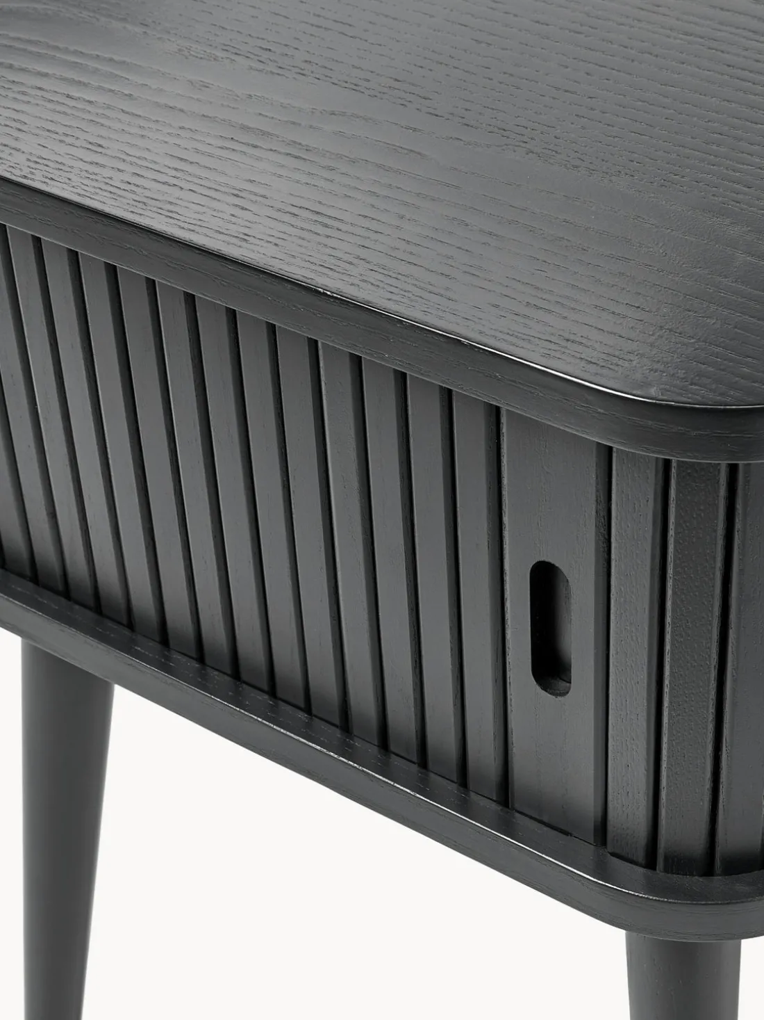 La mesita de noche tiene una puerta enrollable.