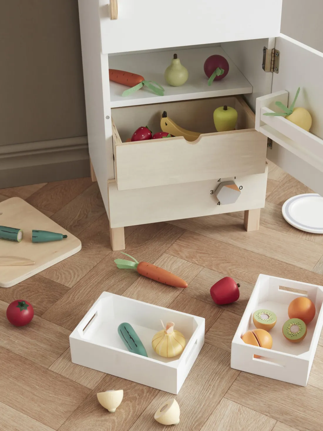 Los niños se lo pasarán en grande guardando la compra en los numerosos compartimentos que también hay en un auténtico nevera-congelador. El frigorífico tiene dos estantes interiores en la puerta, uno de ellos con dos portahuevos, y un cajón adicional en la parte inferior para fruta y verdura. Un interruptor deslizante permite ajustar la temperatura del frigorífico. También hay un interruptor de encendido y apagado con un sonido de clic.