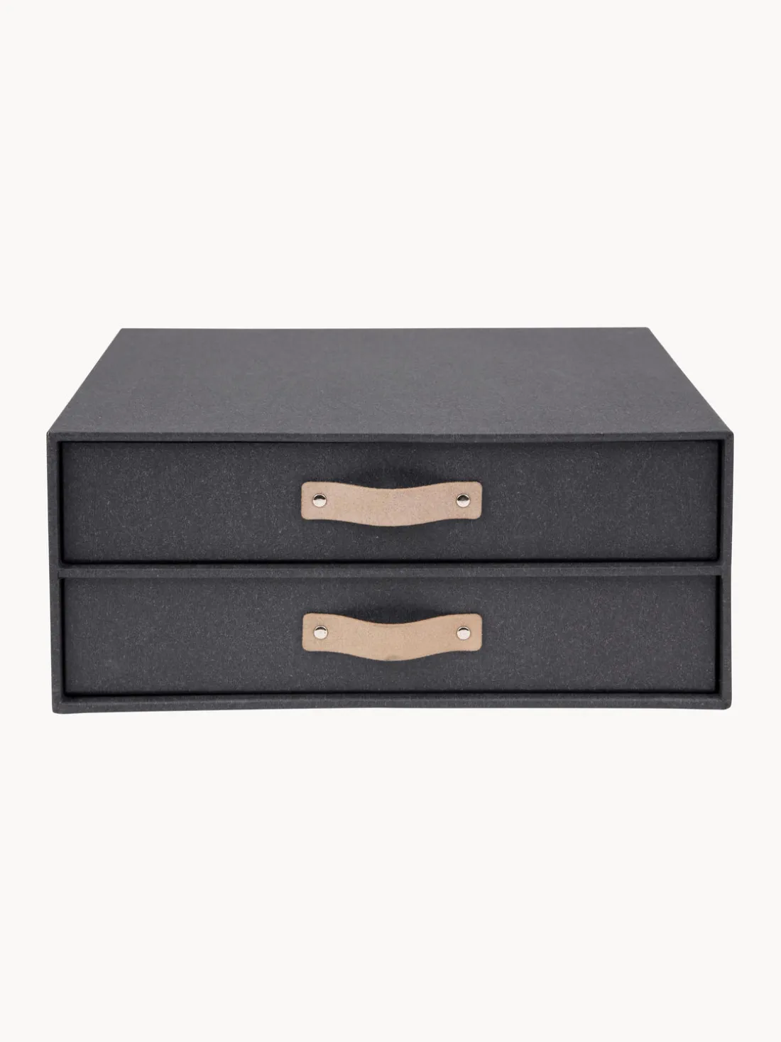 Organizador con dos cajones extraíbles con tiradores de cuero y antideslizantes de goma en la base para mantener orden en tu escritorio. Adecuada para el almacenamiento de documentos de formato DIN A4.