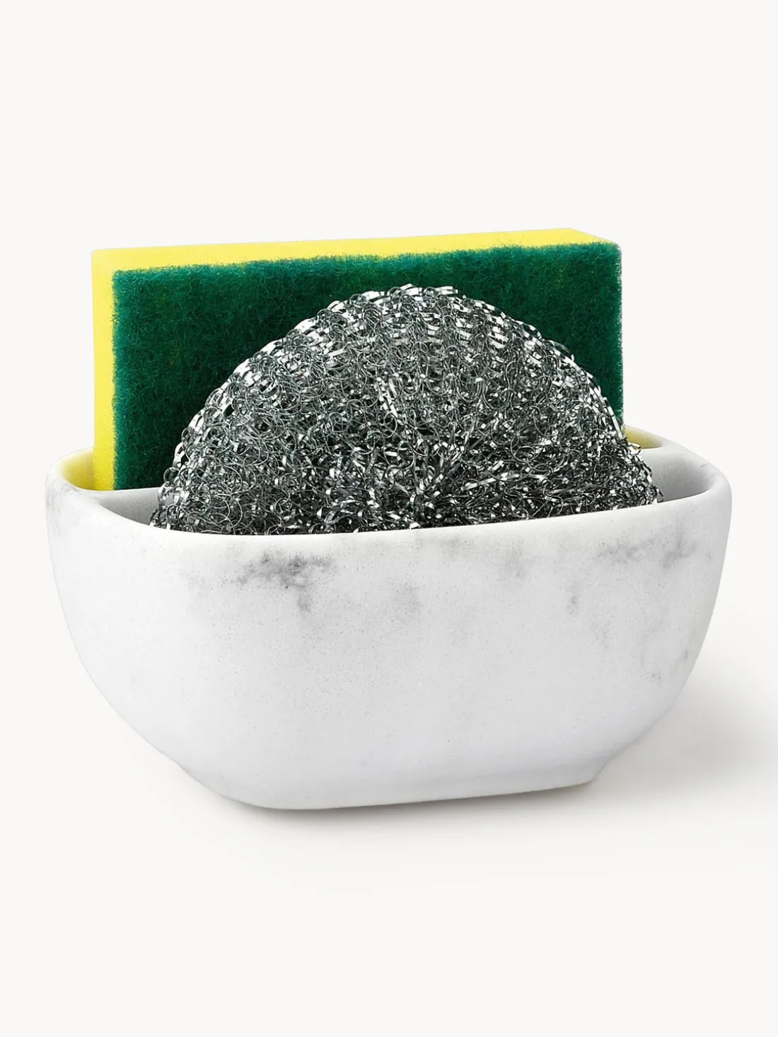 Set de aspecto mármol compuesto de 3 piezas: un soporte para esponjas , un estropaje de acero y una esponja de cocina.