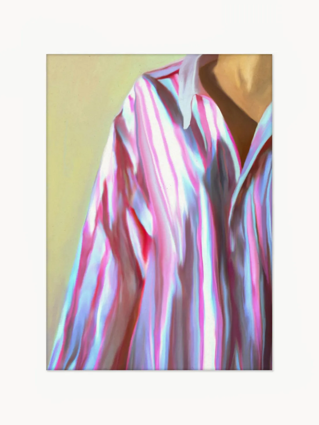 The Dad Shirt, del grupo de arte danés Misfitting Things, presenta una mezcla borrosa de color, textura, luz y sombra creada por capas de pintura digital. Con una camisa de gran tamaño a rayas blancas y rosas, la figura oscurecida parece como si acabara de levantarse de la cama o se estuviera preparando para una reunión de negocios, capturando una sensación de misticismo entre lo formal y lo informal.