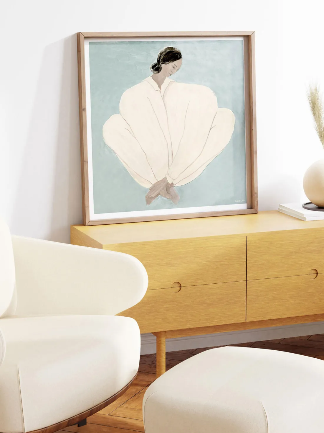 Este sereno póster presenta una figura en reposo envuelta en los suaves pliegues de una prenda sobre un tranquilo fondo azul. Sus líneas suaves y su paleta de colores relajantes evocan una sensación de paz e introspección. Ideal para crear un oasis de calma en tu habitación.