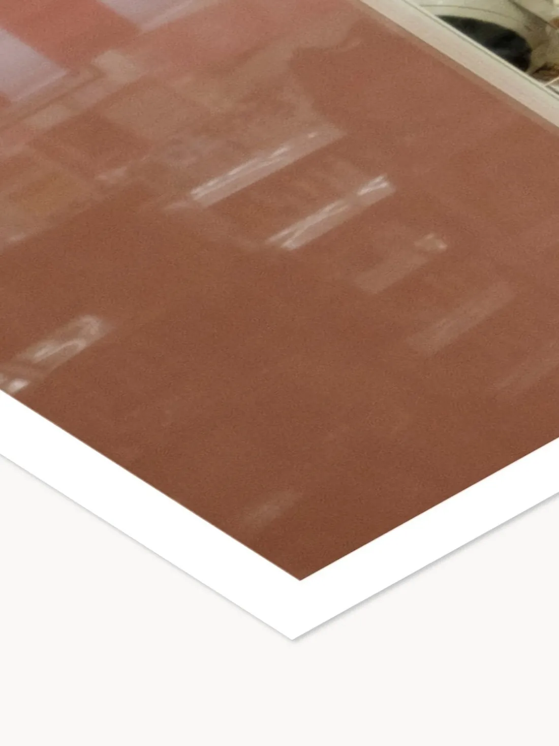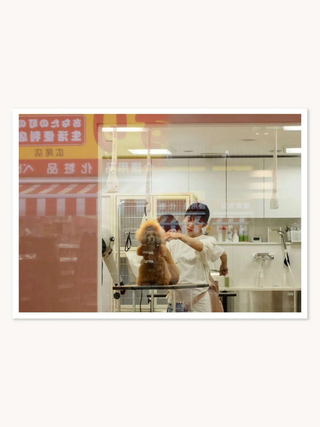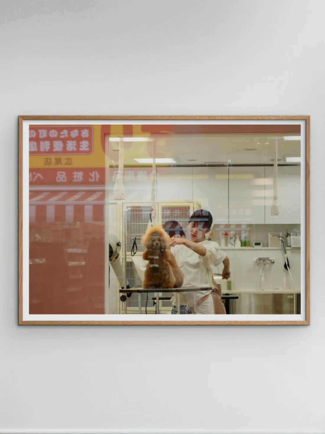 Mejora tu espacio con este impresionante póster que presenta un paisaje sereno, un encantador perro y una persona cautivadora, todo bellamente capturado en suaves tonos de rosa y blanco.