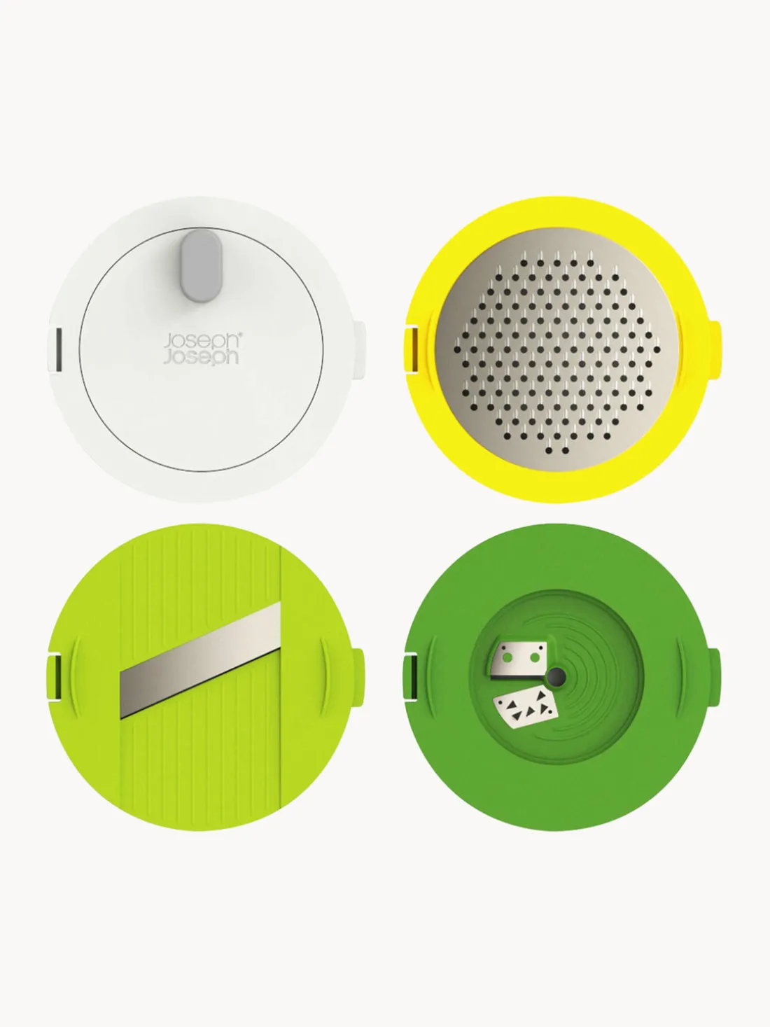 Este set de preparación de ensaladas tiene cuatro discos intercambiables para diferentes tareas: preparación de ensaladas, centrifugador de ensaladas, espiralizador, rallador y rebanador. Inserte el disco codificado por color para la tarea deseada en la tapa y listo. Viene con un práctico protector de dedos que hace que las funciones de corte y rebanado en espiral sean más seguras y cuenta con una base antideslizante.
