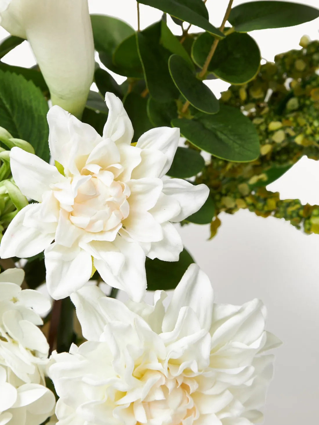 Este ramo presenta una composición equilibrada de suaves flores blancas y frescos toques verdes. Las voluminosas hortensias proporcionan una base exuberante, complementadas por delicadas calas y dalias estructuradas. El follaje texturizado añade dimensión, mientras que los elementos en cascada realzan el movimiento. Este ramo consta de un total de once tallos.