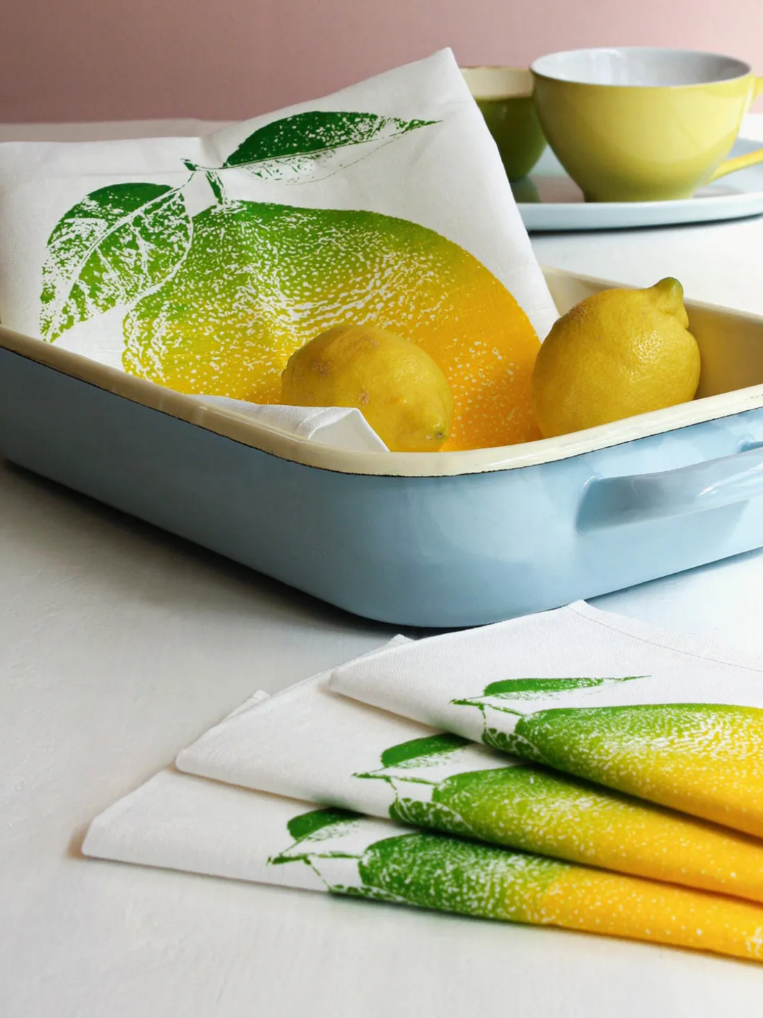 Amarillo brillante con sutiles matices verdes: el motivo de limón se imprime a mano utilizando un elaborado proceso de impresión iris. Esto crea un degradado de color único en cada servilleta. Natural, clara y cuidadosamente impresa en Hamburgo: un acento fresco para tu mesa.