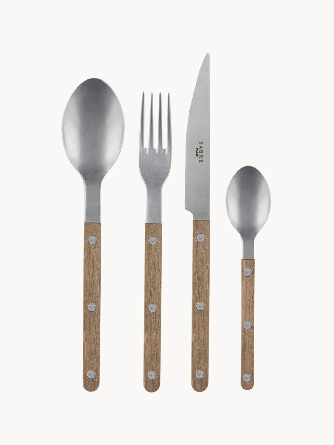 Cubertería de 4 piezas con superficie muy pulida que incluye 1 tenedor, 1 cuchillo, 1 cuchara y 1 cucharilla.
