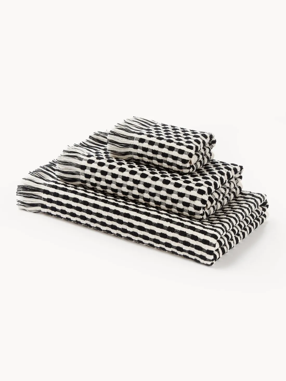 El set de toallas tiene un acabado con flecos y no tiene lazo para colgar. Consta de una toalla tocador, una toalla lavabo y una toalla de baño. Hecho en Portugal.
