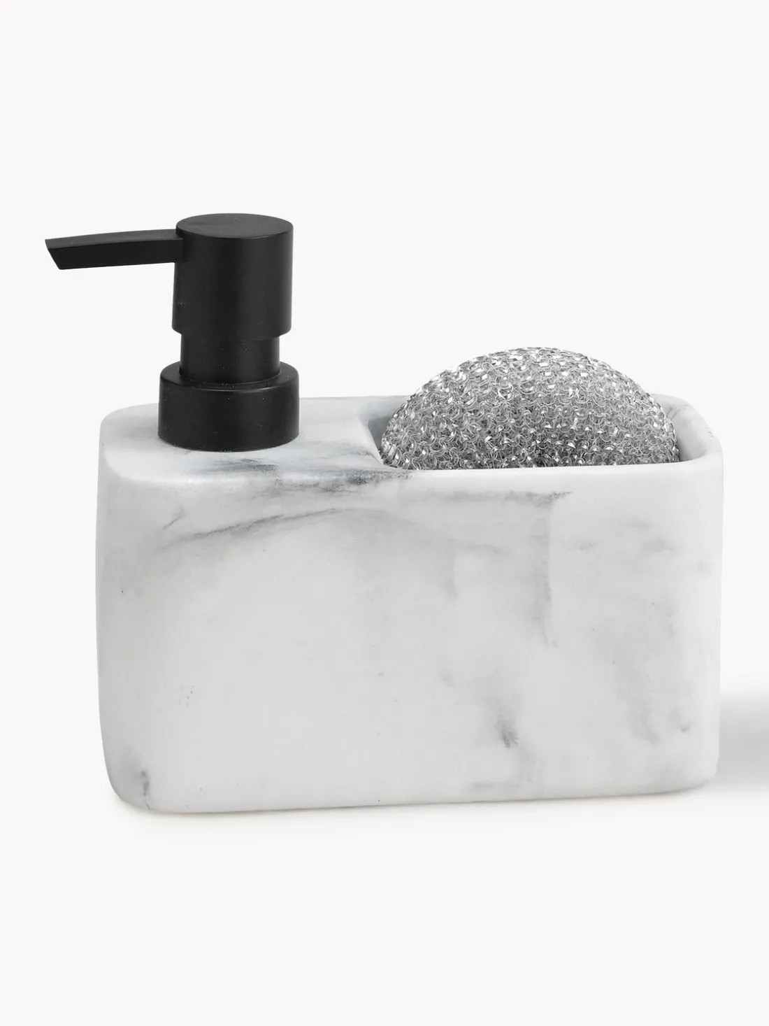 Set lavavajilas formado por un dosificador de jabón con estropajo metálico.