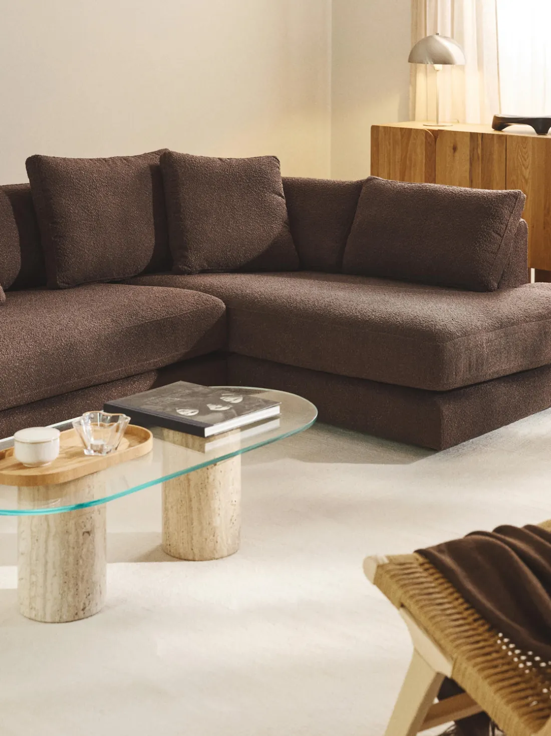 La chaise longue está en el lado derecho cuando estás frente al sofá.