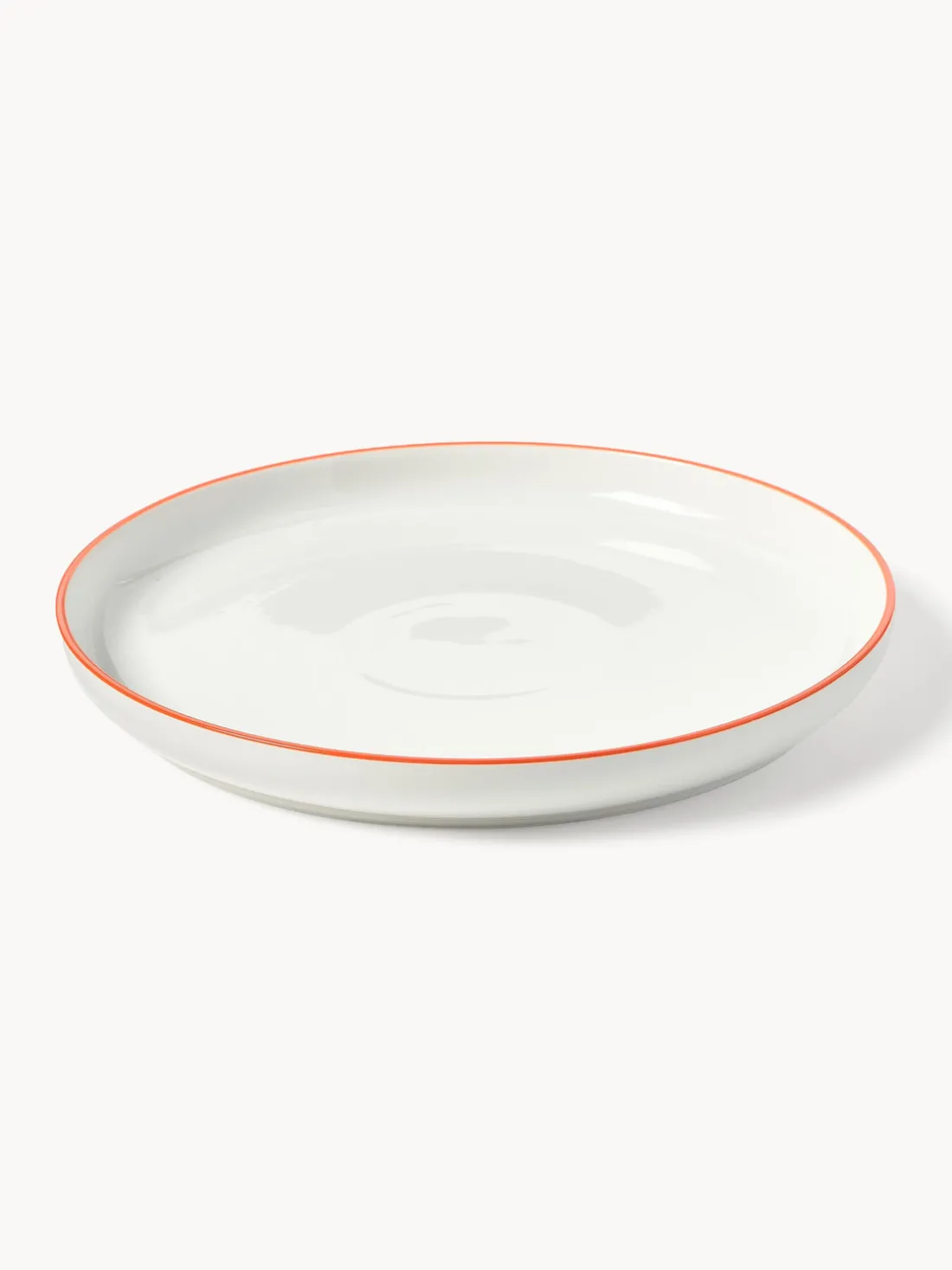 Esta vajilla de 18 piezas con borde naranja se compone de seis platos llanos, seis platos hondos y seis platos postre.