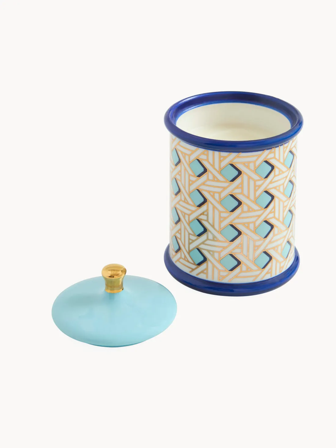 Crafting Modernidad. La vela WASP está vertida en un tarro de porcelana de alta cocción envuelto en tejido clásico de Palm Beach acentuado con oro brillante y acabado con un esmalte brillante. Con una tapa extraíble, es el recipiente perfecto para guardar tus secretos una vez que la vela se haya consumido.