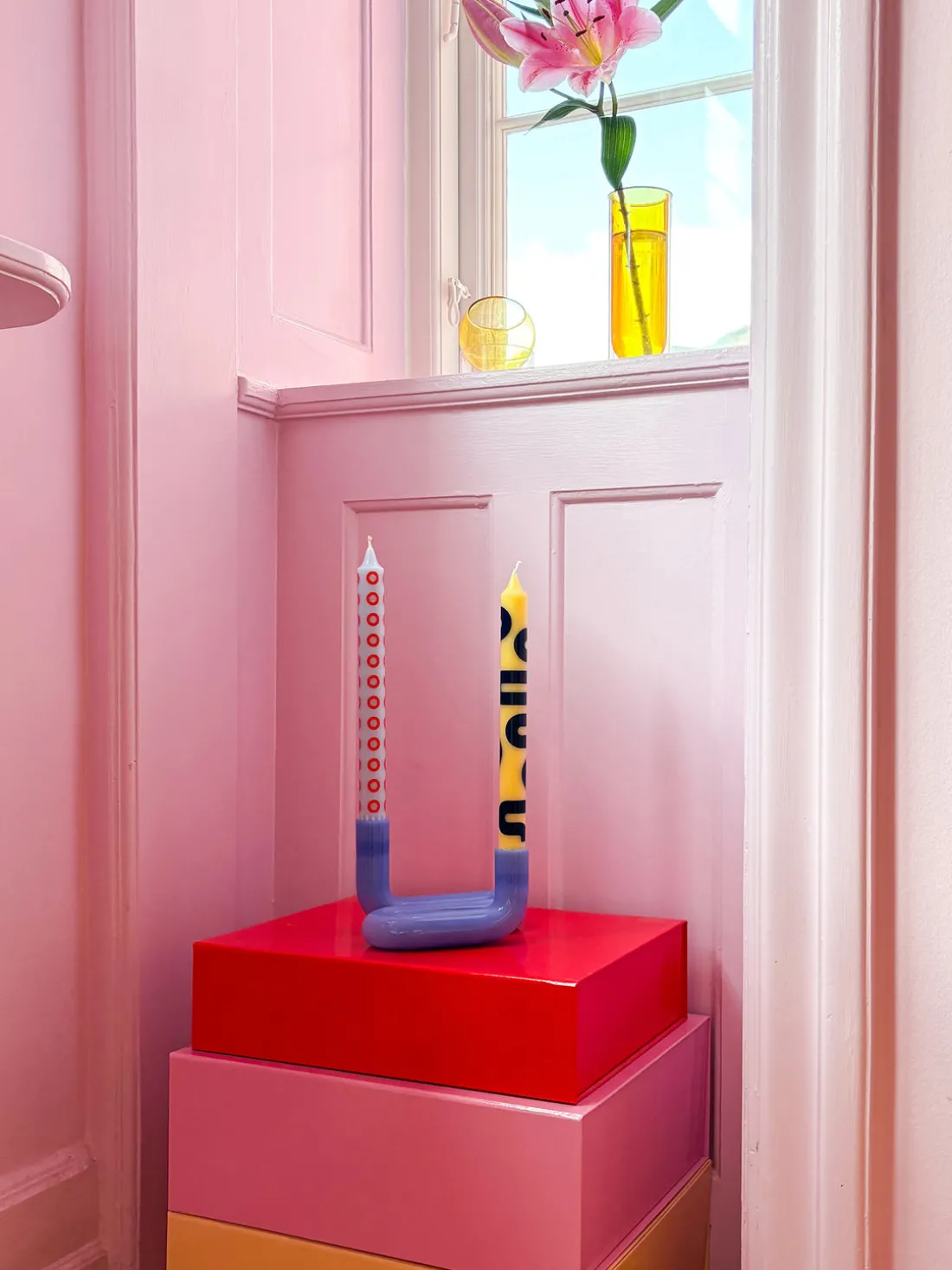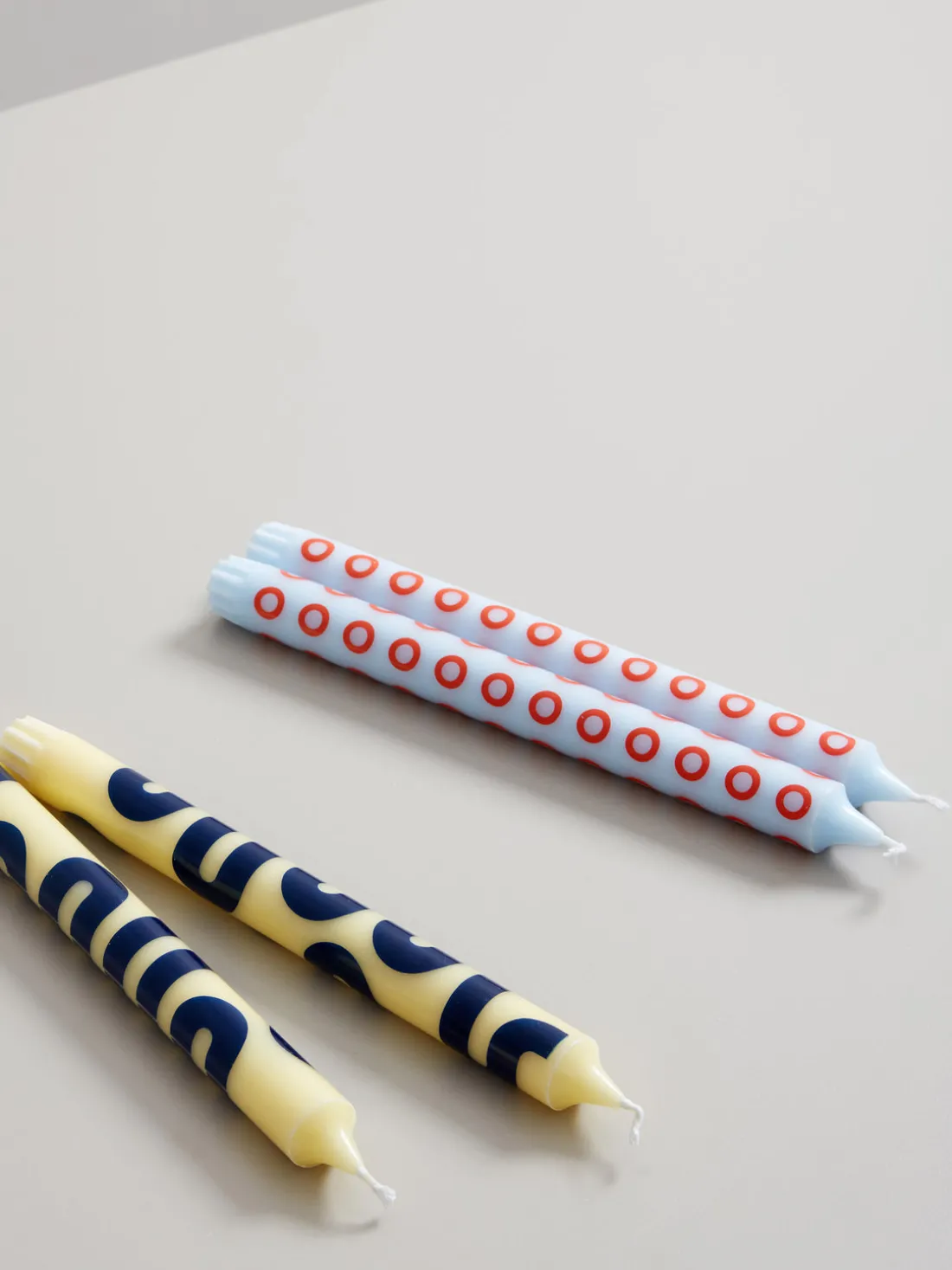 La colección de velas HAPPY incluye una selección de cuatro colores diferentes y dos patrones gráficos. Tienen las mismas dimensiones que las velas clásicas, por lo que son perfectas para cualquier candelabro estándar.
