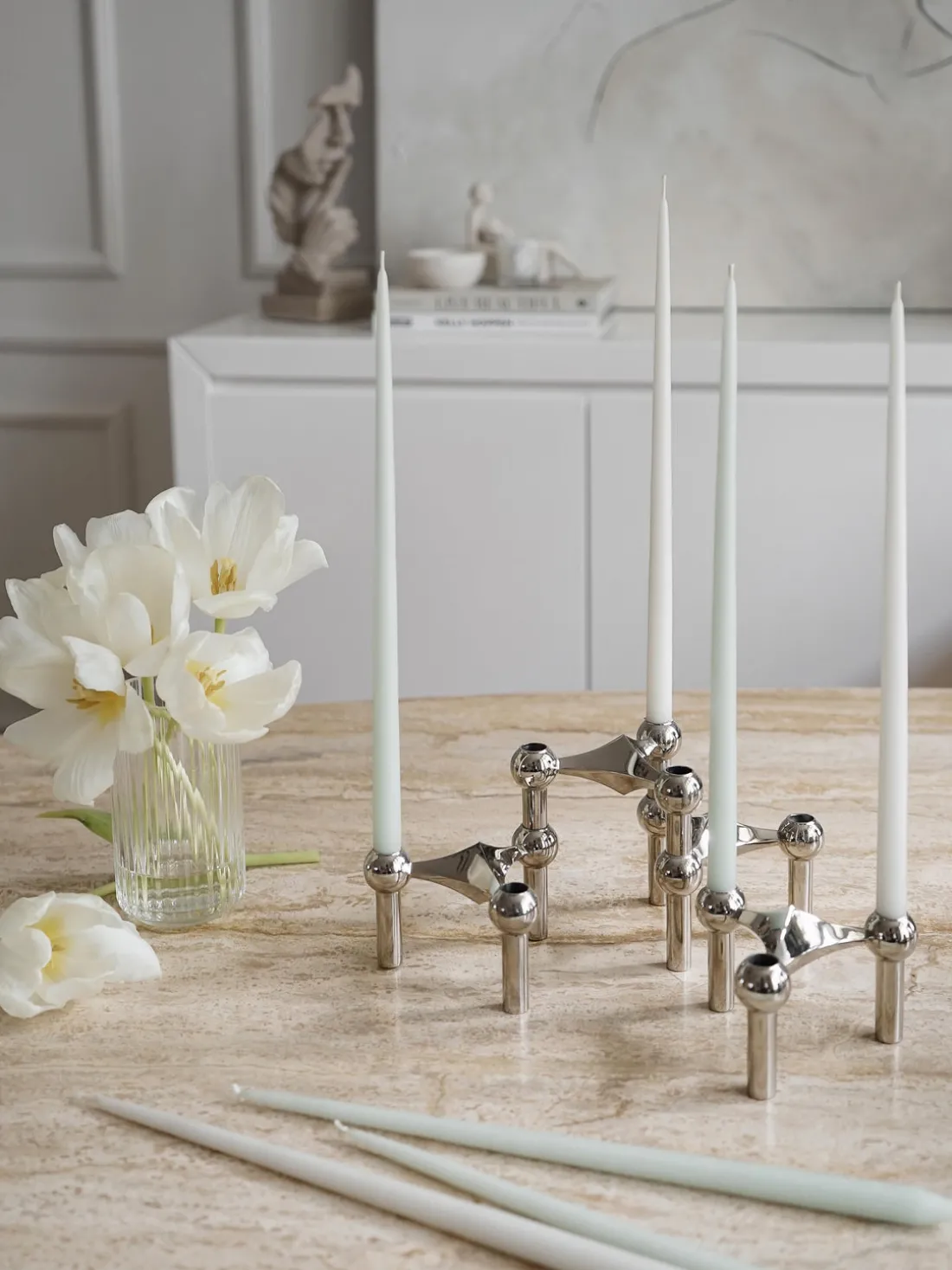 Las exclusivas velas cónicas Stoff Nagel de los daneses Ester & Erik tienen una forma alargada y una base cónica para que encajen perfectamente en los portavelas cónicos Stoff. Las velas no gotean, son autoextinguibles y arden lenta y elegantemente, sin dejar residuos en el candelabro.